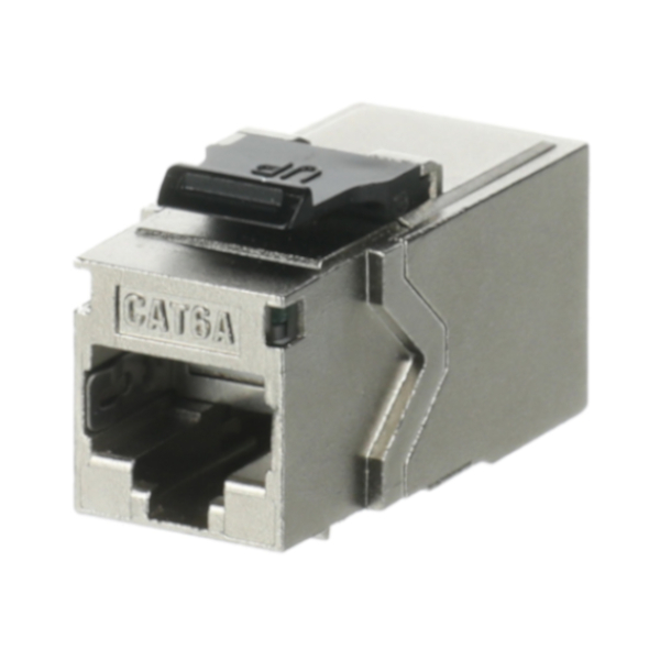 Modulárna spojka RJ45 so 90° uhlom pre špeciálne inštalačné situácie (napr. prefabrikácia). Možnosť Plug&Play inštalácie so štandardným RJ45 patch káblom. Vhodná pre 10GB Ethernet siete (do 500 MHz). V súlade s normou ISO/IEC 11801, trieda EA, tienená.