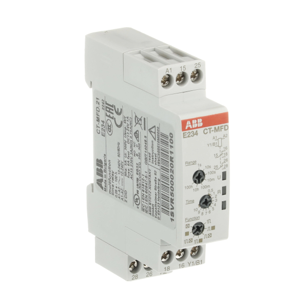 Časové funkcie: multifunkčné oneskorenie pri ON, oneskorenie pri OFF s pomocným napätím, impulz pri ON, impulz pri OFF, impulz pri OFF s pomocným napätím, blikač štartujúci pri ON, blikač štartujúci pri OFF, tvarovač pulzov)