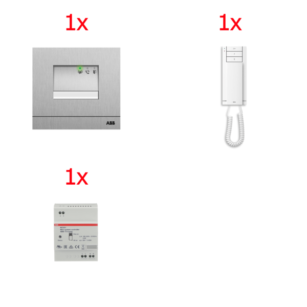 Zostava domových AUDIOtelefónov ABB-Welcome obsahujúca: 1xtelefón domový, 3tlačidlový, so slúchadlom (M22002-W-02); 1xjednotka riadiaca univerzálna MINI (650 mA), radová (M2301-101); 1xmodul hlasový, s tlačidlom 1/2, s 2 kontaktmi (M251022A-A-02); 1xkryt audio tabla, veľkosť 1/1, eloxovaný hliník (41391CF-A); 1xkrabica inštalačná, zapustená, veľkosť 1/1 (41381F-H).