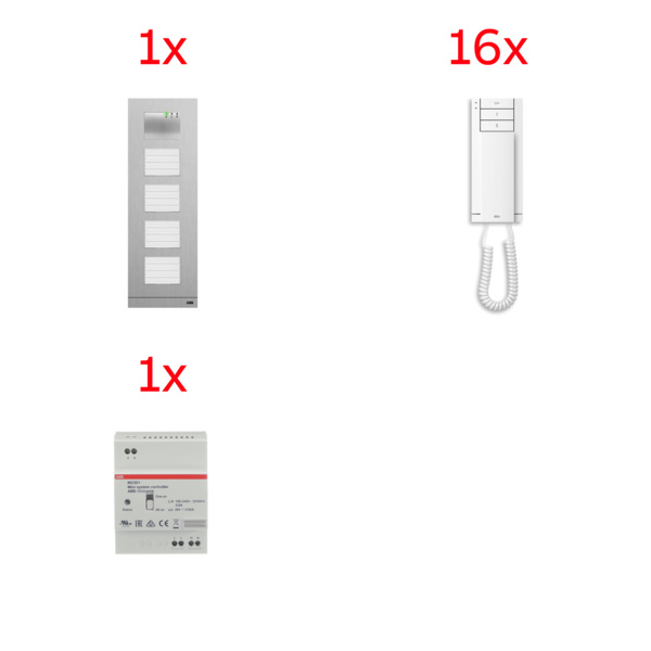 Sestava domovních AUDIOtelefonů ABB-Welcome obsahující: 16xtelefon domovní, 3tlačítkový, se sluchátkem (M22002-W-02); 1xjednotka řídicí univerzální MINI (650 mA), řadová (M2301-101); 1xmodul hlasový, se 2 kontakty (M251021A-A-02); 4xmodul tlačítkový, s tlačítky 4/8 (51381SP4); 1xkryt audio tabla, velikost 1/5, eloxovaný hliník (41395CF-A); 1xkrabice instalační, zapuštěná, velikost 1/5 (41385F-H).