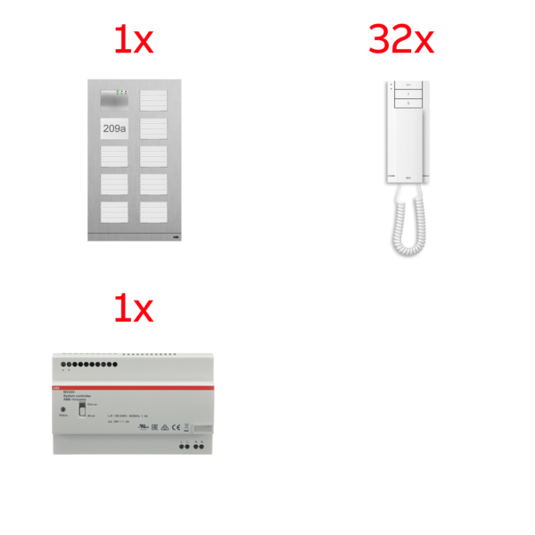 Zostava domových AUDIOtelefónov ABB-Welcome obsahujúca: 32xtelefón domový, 3tlačidlový, so slúchadlom (M22002-W-02); 1xjednotka riadiaca univerzálna (1200 mA), radová (M2300-101); 1xmodul hlasový, s 2 kontaktmi (M251021A-A-02); 8xmodul tlačidlový, s tlačidlami 4/8 (51381SP4); 1xmodul zaslepovací/adresovací/informačný (demontovateľná krytka) (51021DN-02); 1xkryt audio tabla, veľkosť 2/5, eloxovaný hliník (413910CF-A); 2xkrabica inštalačná, zapustená, veľkosť 1/5 (41385F-H).