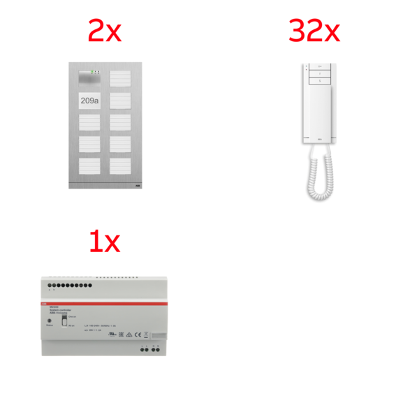 ABB-Welcome home AUDIOphone set obsahujúci: 32x domáci telefón, 3-tlačidlový, so slúchadlom (M22002-W-02); 1x univerzálna riadiaca jednotka (1200 mA), in-line (M2300-101); 2x hlasový modul s 2 kontaktmi (M251021A-A-02); 16xModul tlačidiel so 4/8 tlačidlami (51381SP4); 2xKryt zvukového panela, veľkosť 2/5, eloxovaný hliník (413910CF-A); 4x inštalačná krabica, zapustená, veľkosť 1/5 (41385F-H).