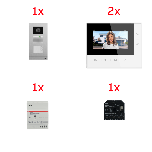 Sestava domovních VIDEOtelefonů ABB-Welcome obsahující: 2xvideotelefon domovní 4,3", nástěnný (M22481-W); 1xrozdělovač videosignálu pro vnitřní sběrnici (M2304-02); 1xjednotka řídicí univerzální MINI (650 mA), řadová (M2301-101); 1xmodul hlasový/kamerový (M251381M); 1xmodul tlačítkový, 2násobný (51381RP2); 1xkryt video tabla, velikost 1/3, eloxovaný hliník (41383CF-A); 1xkrabice instalační, zapuštěná, velikost 1/3 (41383F-H).