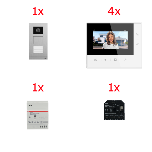 Sestava domovních VIDEOtelefonů ABB-Welcome obsahující: 4xvideotelefon domovní 4,3", nástěnný (M22481-W); 1xrozdělovač videosignálu pro vnitřní sběrnici (M2304-02); 1xjednotka řídicí univerzální MINI (650 mA), řadová (M2301-101); 1xmodul kamerový (M251021C-02); 1xmodul hlasový, se 2 kontakty (M251021A-A-02); 1xmodul tlačítkový, s tlačítky 4/8 (51381SP4); 1xkryt audio tabla, velikost 1/3, eloxovaný hliník (41393CF-A); 1xkrabice instalační, zapuštěná, velikost 1/3 (41383F-H).