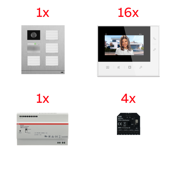 Zostava domových VIDEOtelefónov ABB-Welcome obsahujúca: 16xvideotelefón domový 4,3", nástenný (M22481-W); 4xrozdeľovač videosignálu pre vnútornú zbernicu (M2304-02); 1xjednotka riadiaca univerzálna (1200 mA), radová (M2300-101); 1xmodul kamerový (M251021C-02); 1xmodul hlasový, s 2 kontaktmi (M251021A-A-02); 4xmodul tlačidlový, s tlačidlami 4/8 (51381SP4); 1xkryt audio tabla, veľkosť 2/3, eloxovaný hliník (41396CF-A); 1xkrabica inštalačná, zapustená, veľkosť 2/3 (41386F-H).