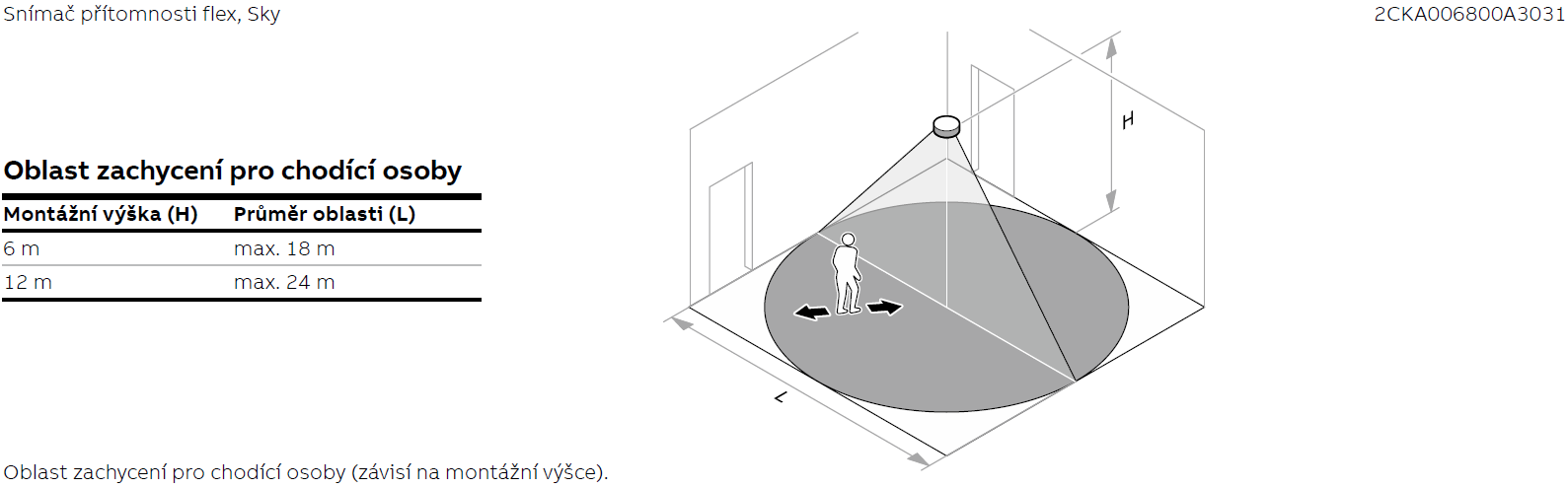 Oblasť zachytenia: kužeľová (pri montážnej výške 6 m / 12 m je priemetom na podlahu kruh ∅ 18 m / 24 m pre chodiace osoby).